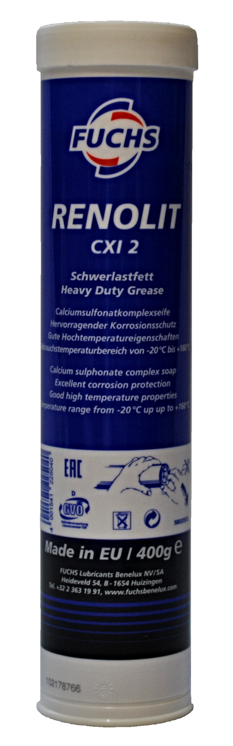 Fuchs Renolit CXI 2 calcium grease should be used for all lubrication points requiring a high performance concerning water resistance, working stability, EP and AW properties. Fuchs Renolit CXI 2 calcium grease is easily pumpable even in long tubes, fed by centralised lubrication systems. Fuchs Renolit CXI 2 calcium grease was developed to work under severe conditions in plain and roller bearings in steel mills,