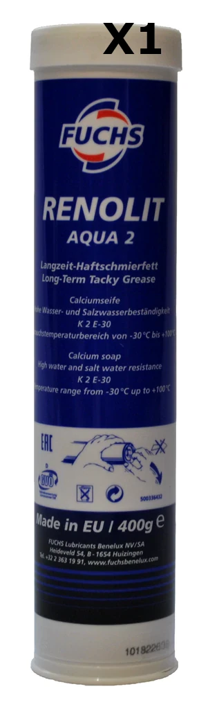 Fuchs Renolit Aqua 2 Grease water resistant grease has Industrial applications such as, areas that are subject to water or cutting fluid wash off. Automotive, quarry and mining applications in wet areas. Boats and boat trailers. Suitable for stern tube greasing. Bearings subject to high alkalinity or degreasing fluids and washes. Booms on cranes, wire ropes etc.